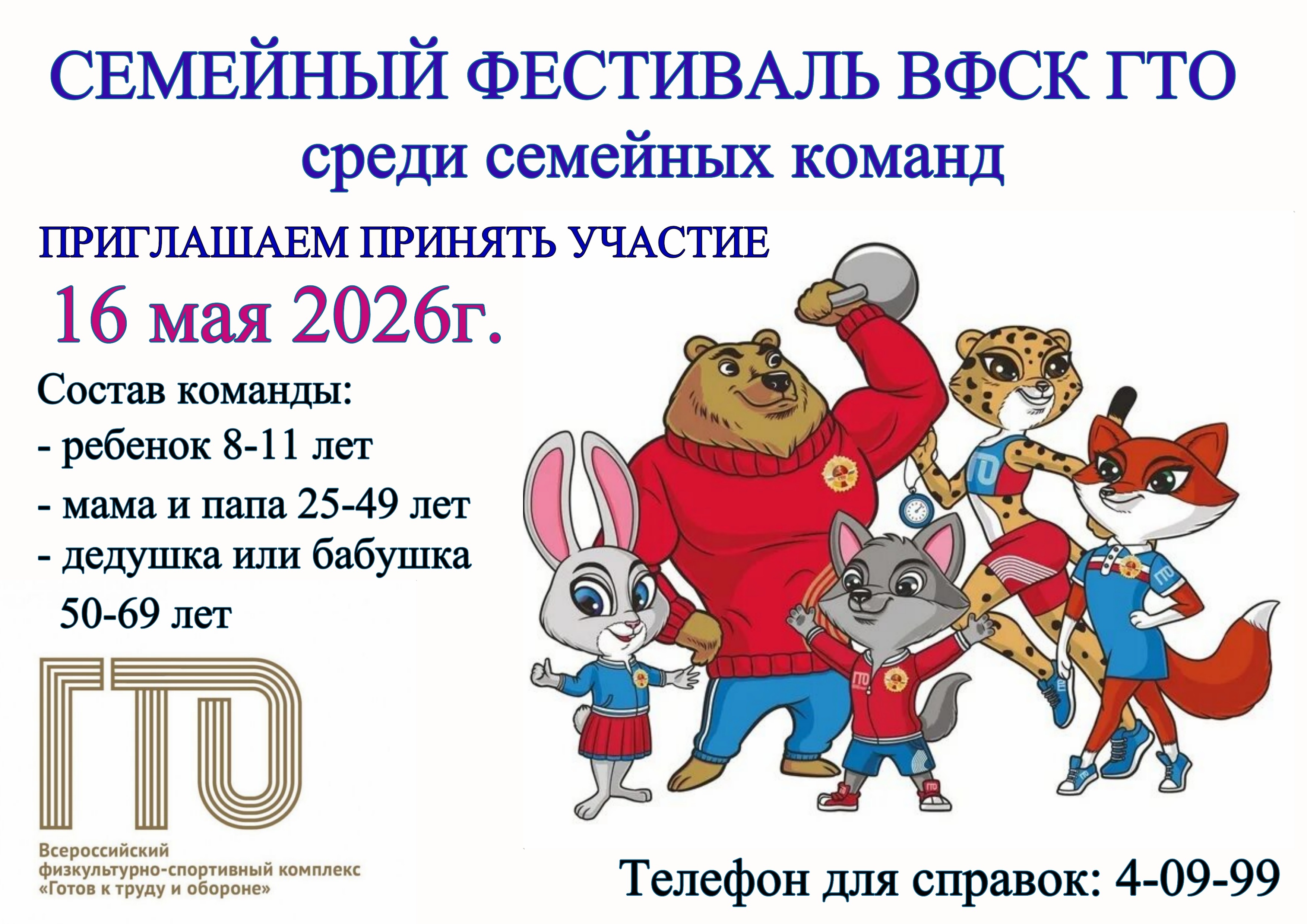16 мая 2026 года двери МАУ «СК «Темп» откроются для всех, кто ценит семейные ценности, активный образ жизни и спортивный азарт! Приглашаем вас принять участие в увлекательном семейном фестивале ВФСК ГТО. Это уникальная возможность провести время с близкими, проверить свои силы в различных видах спортивных испытаний и получить заряд позитивных эмоций. Фестиваль рассчитан на разные возрасты, поэтому каждый член семьи сможет проявить себя!