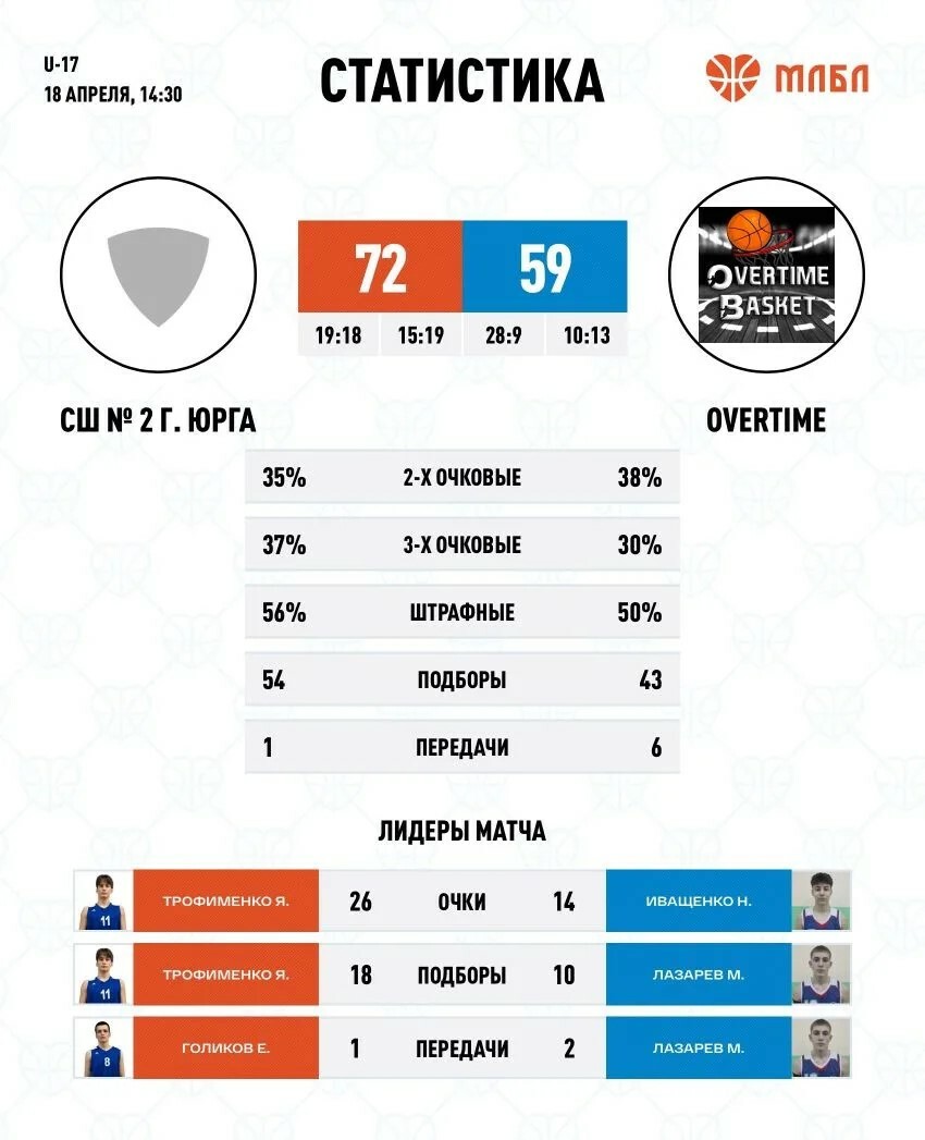 18 апреля в городе Кемерово прошла очередная встреча нашей команды «СШ-2 Юрга» (U17) в рамках турнира МЛБЛ. Встреча закончилась победой наших баскетболистов со счётом 72:59. Желаем удачи!